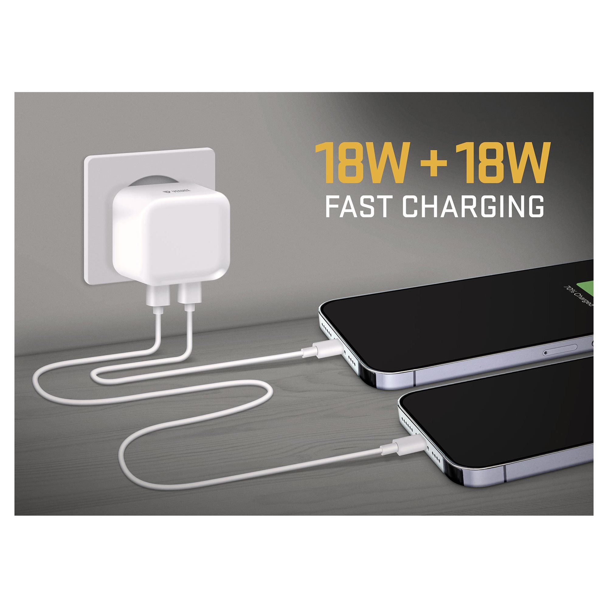 YENKEE YAC 2133 punjač ima dva USB-C izlaza ukupne snage 36W, tako da možete puniti dva uređaja odjednom. Na primer, dva mobilna telefona, dva tableta ili mobilni telefon i tablet u isto vreme. U ovom slučaju, YENKEE YAC 2133 punjač isporučuje 18W snage na svaki izlaz, što je više nego dovoljno za brzo punjenje.