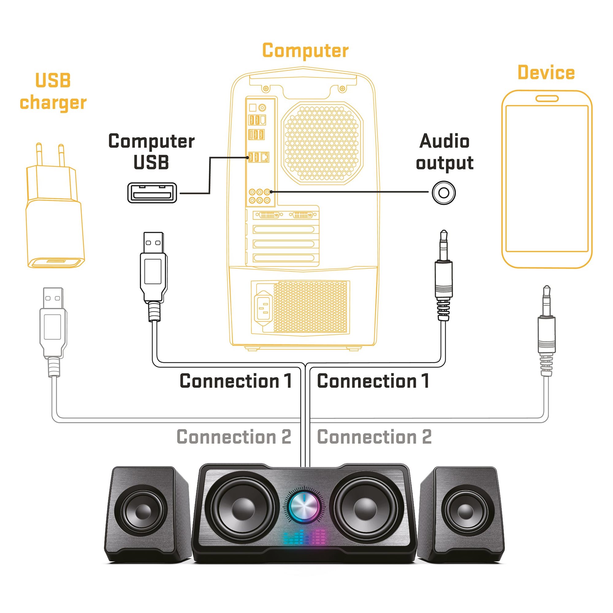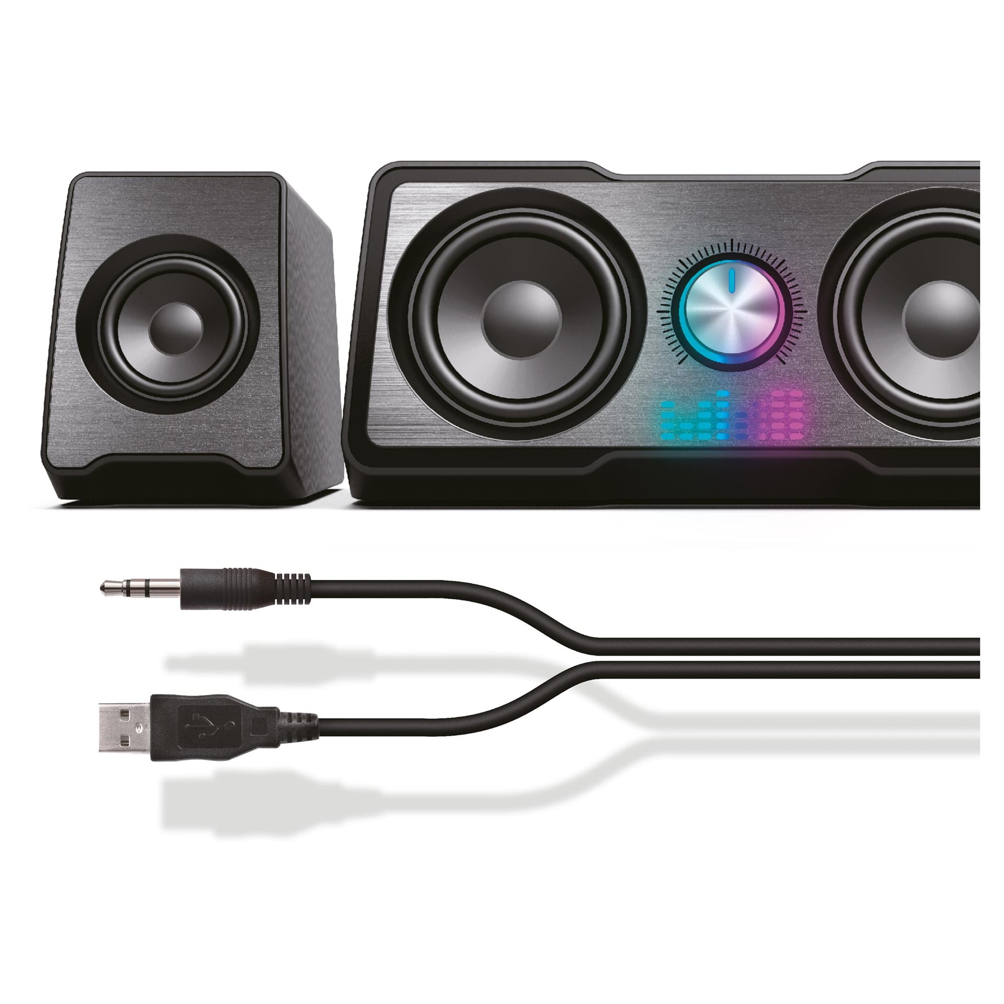 Moja najveća prednost je, međutim, jednostavnost upotrebe, sa kojom čak i dete može da se nosi. Ja isporučujem kvalitetan zvuk preko audio priključka od 3,5 mm koji jednostavno uključite u PC utičnicu. Isto je i sa kontrolom jačine zvuka, koju kontrolišete preko velikog dugmeta na prednjoj strani vufera. Napajanje se obezbeđuje preko USB kabla koji povezuje zvučnike i računar. Zato se priključite i uživajte u muzici!