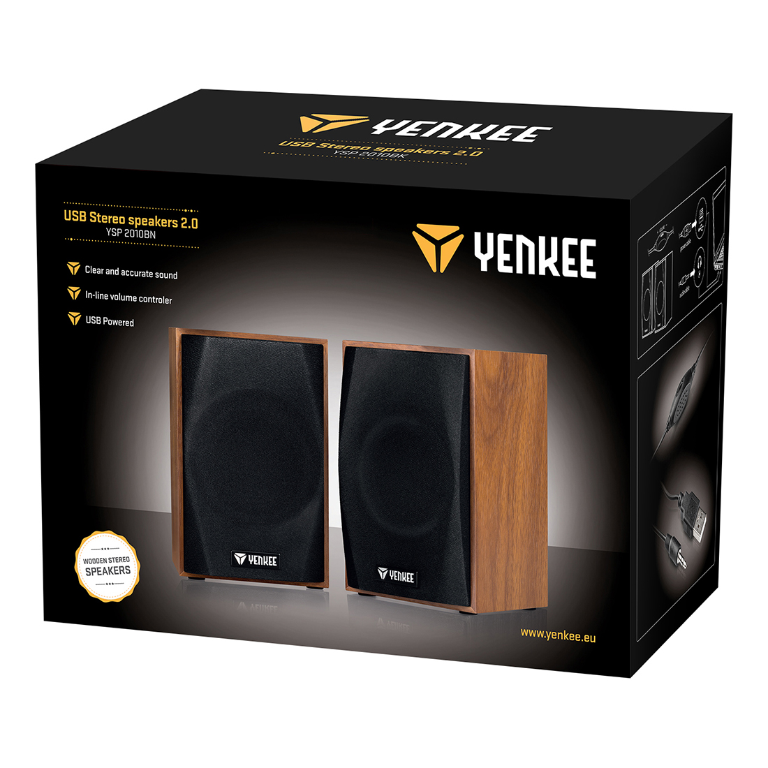 Drveni stereo zvučnici napajani preko USB-a, čistog i preciznog zvuka, poboljšavaju reprodukciju zvuka preko računara. Signal se prenosi putem standardnog stereo konektora od 3,5 mm.