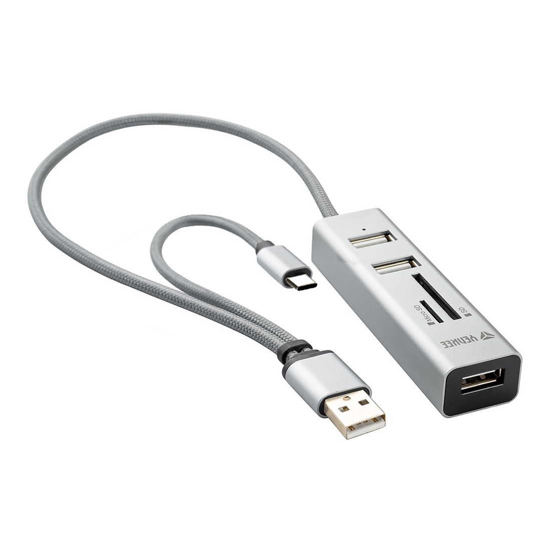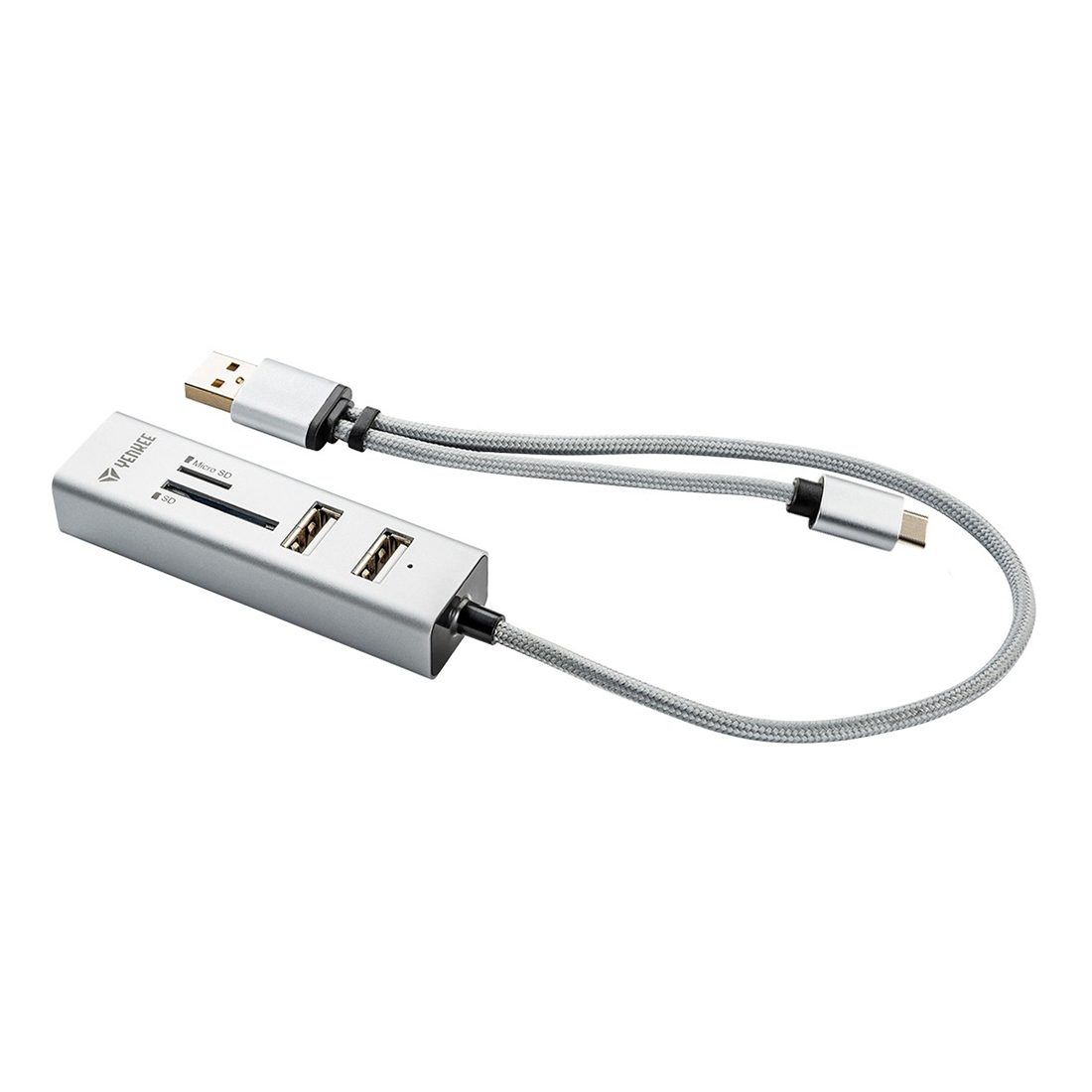 Moderan 2.0 USB adapter koji kombinuje USB čvorište sa čitačem kartica uključujući dodatni USB C OTG priključak za mobilne uređaje. Proširuje vaš računar ili mobilni uređaj sa tri dodatna USB prilkjučka, omogućavajući vam da priključite eksterne uređaje kao što su miš, tastaturea, telefone, eksterne hard diskove, fleške, itd.